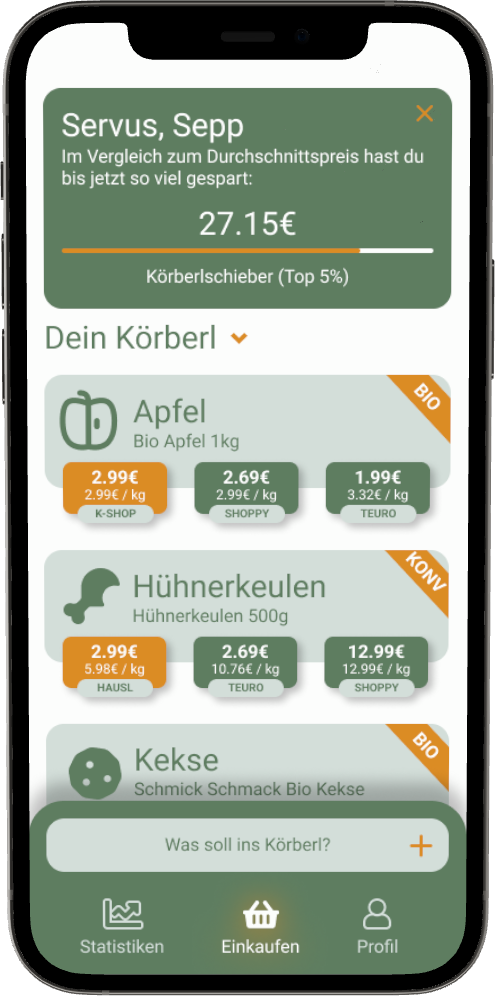 Körberl kann dich in vielerlei Hinsicht unterstützen. Neben der Erstellung deiner individuellen Einkaufsliste zur besseren Organisation, kannst du durch die Anzeige von Echtzeitpreisen sparen.